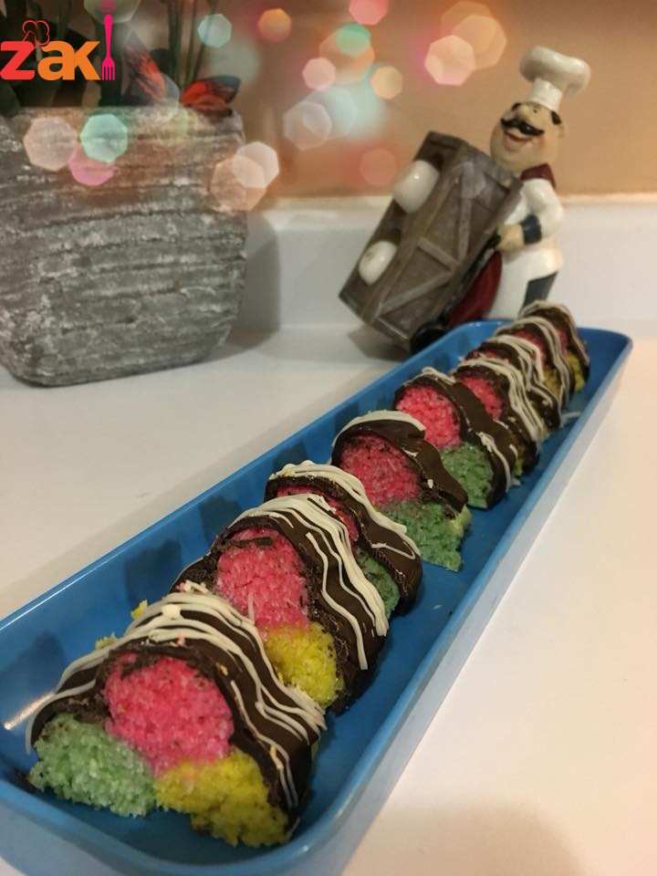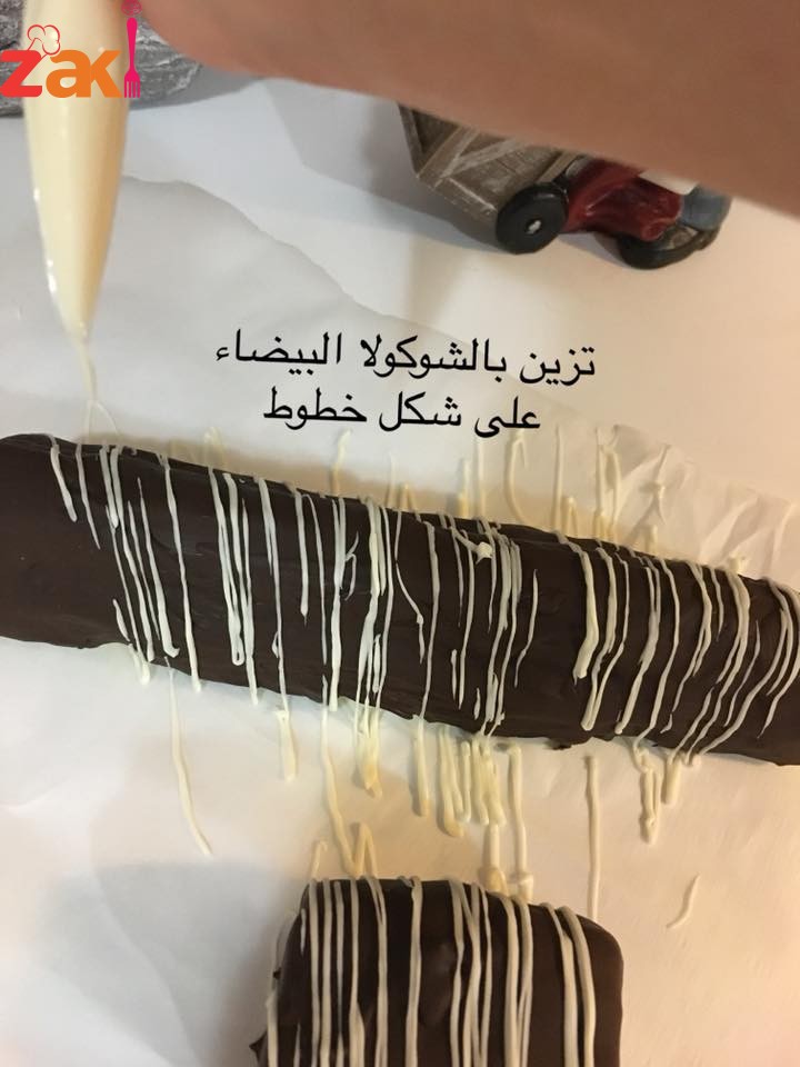 نقوم تذويب الشوكولا على حمام مائي بعد ان تذوب نضيف ٣ ملاعق طعام من الزيت ونحرك نخرج جوز الهند من الفريزة نضعه على شبك ونصب الشوكولا فوقه ستجمد الشوكولا بسرعة لان جوز الهند بارد تزين بالشوكولا البيضاء ثم تقطع وتقدم