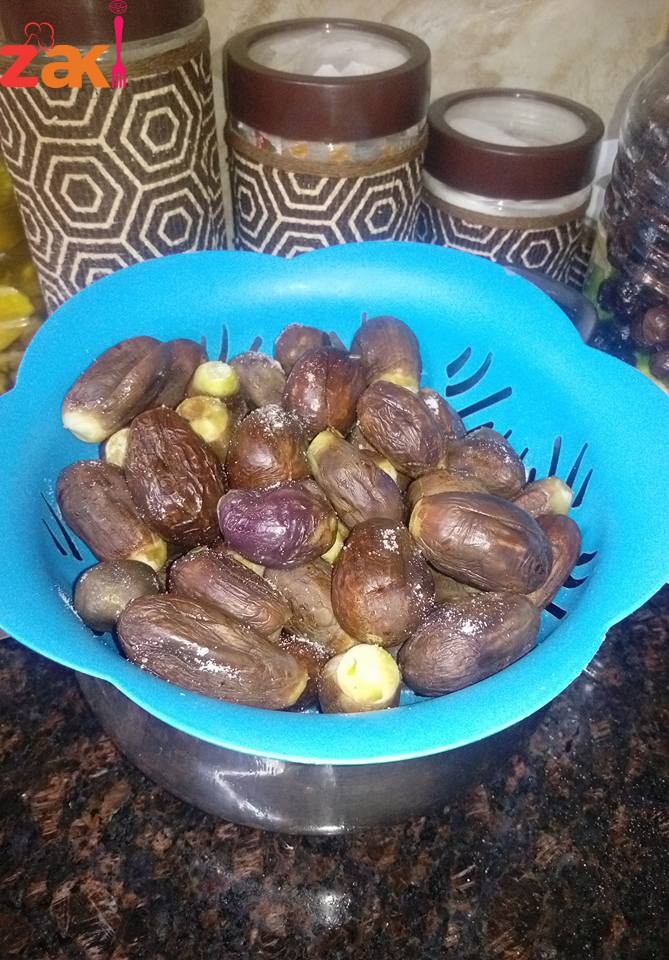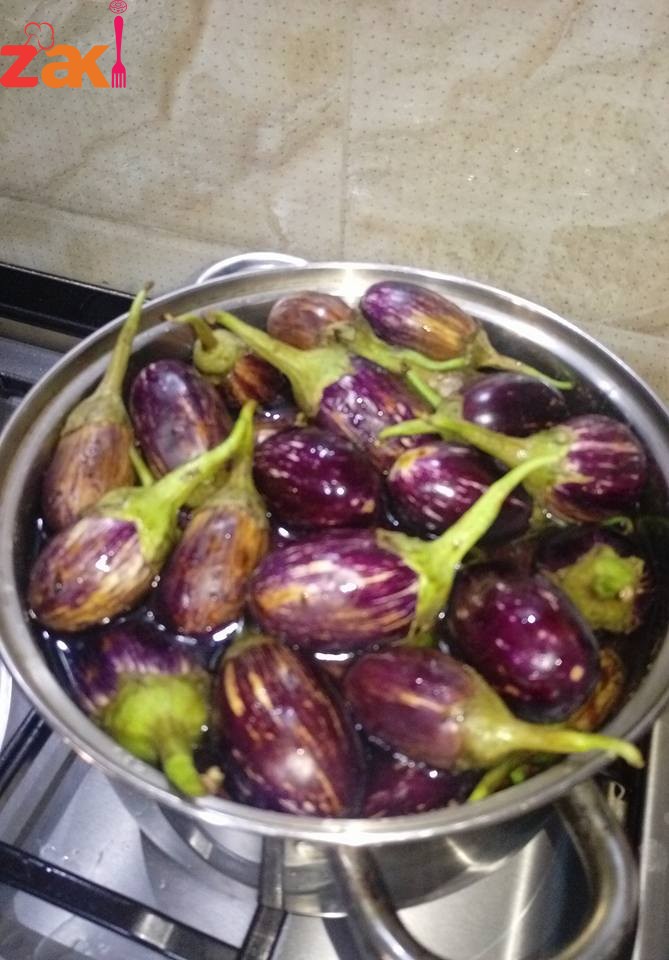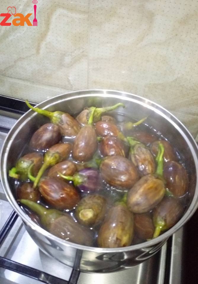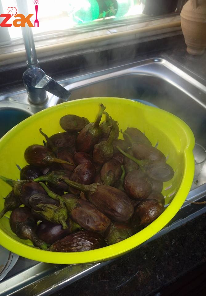 بجيب الباذنجان وبغسله وبسلقه بالقمعة تبعته بس ما بخليه يذوب المهم كل حبة تكون جنب اختها وبحطهم بمصفاية وبصفيهم وبعدين بشيل القمعة وبشقهم بالسكينة كل حبة لوحدها وبرش شوية ملح بكل حبة وبتركهم يتصفوا