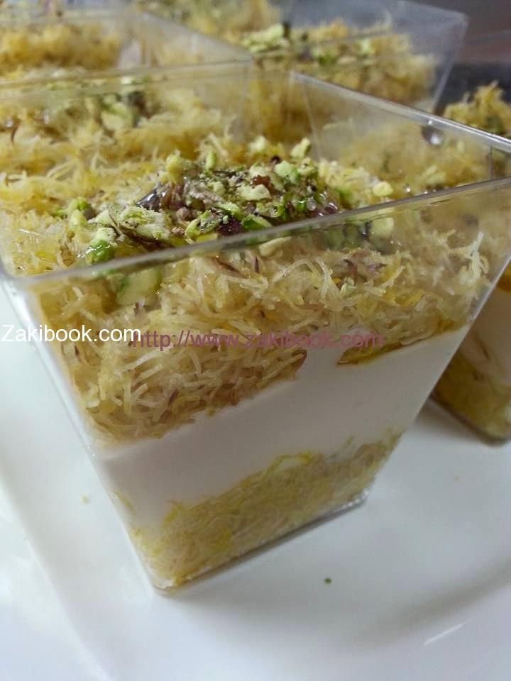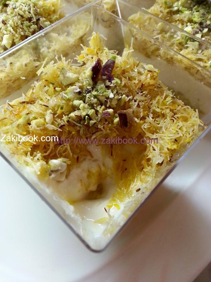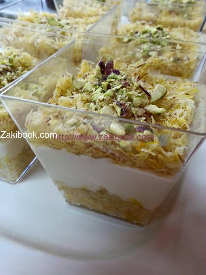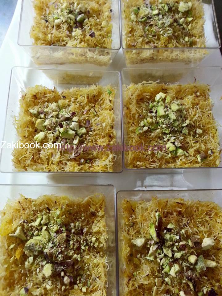 – ضعي خليط الكنافة في كاسات التقديم, ورصيها جيداً وشربيها بالقطر.