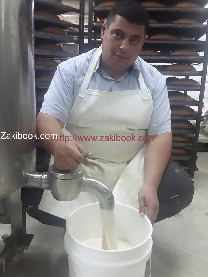 – في وعاء نضع 600 غرام طحين و لتر ماء دافئ و معلقه صغيره مستكه معلقه صغيره محلب معلقه كبيره حليب بودره بنخفق جميع المواد بلخلاط.