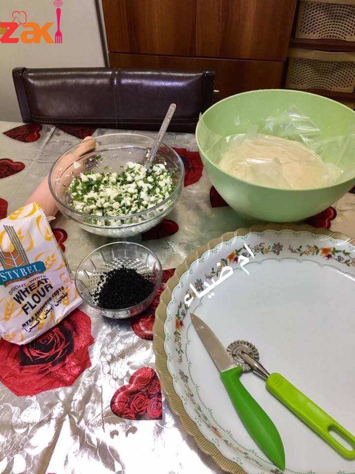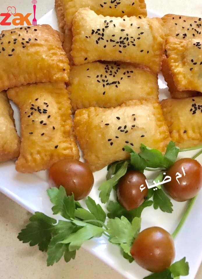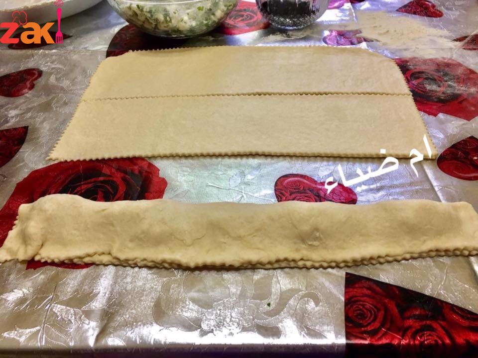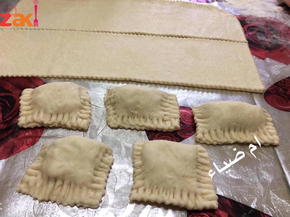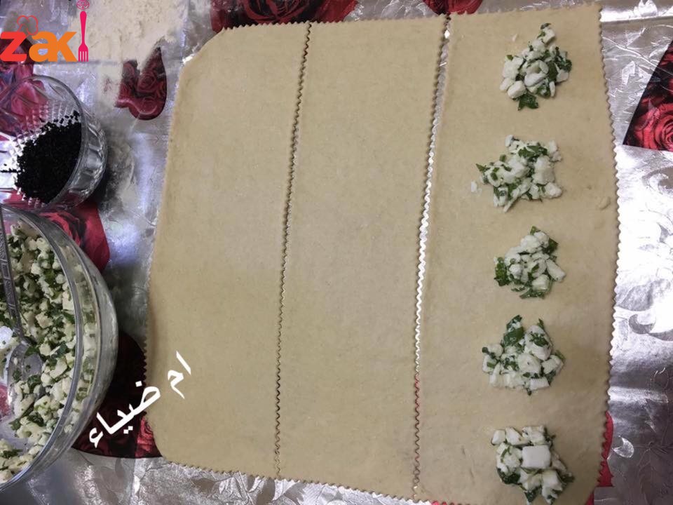 - تفرد العجينة بواسطة الشوبك على شكل مستطيل سمك 0.25 سم ثم تقطع لاربعه مستطلات توضع الجبنه من الطرف وتلف العجينة ونضغط عليها بطرف الشوكه ثم تعمل على شكل مربع وتصف على صينية