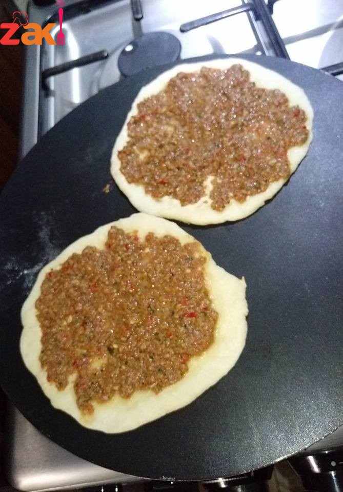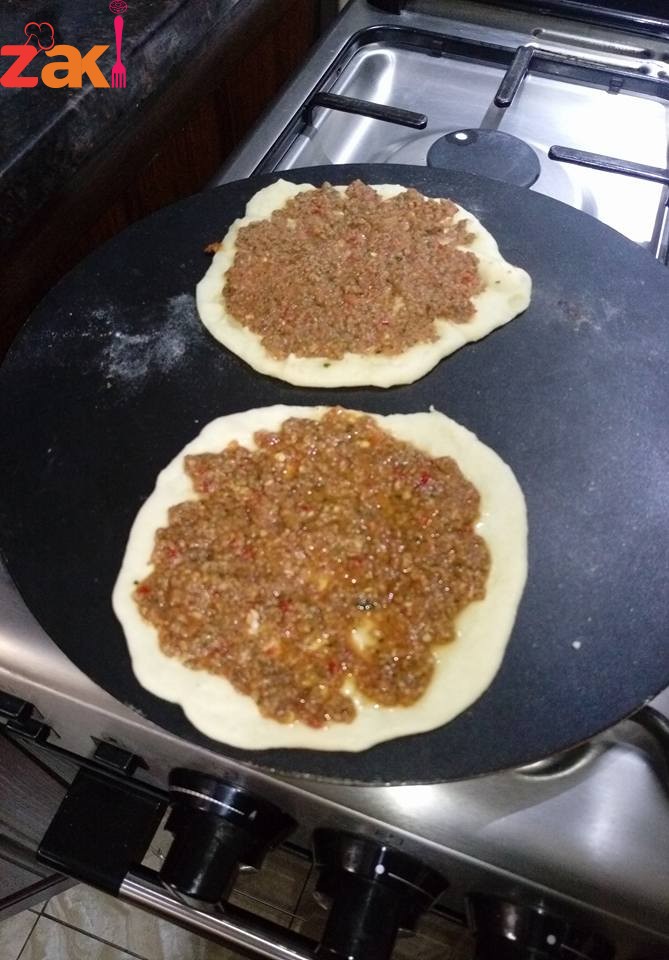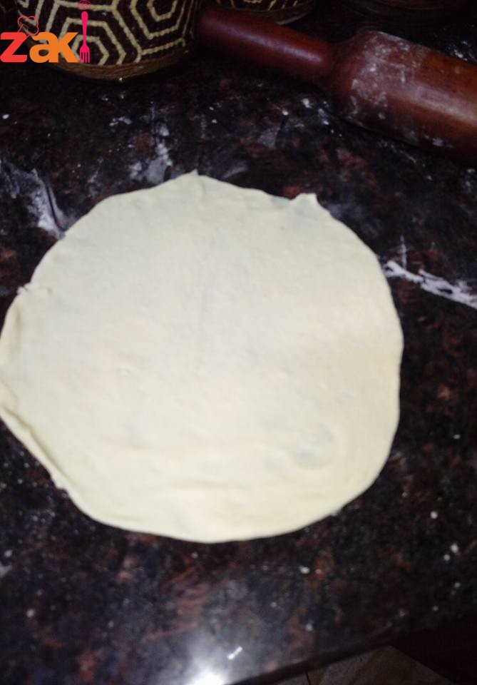 بتحطي صاجة تيفال على راس الغاز او مقلاة تيفال .بترقي كرة من العجين بشكل دائري حتى تصبح رقيقة نوعا ما