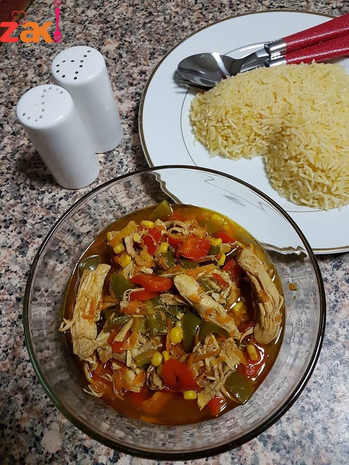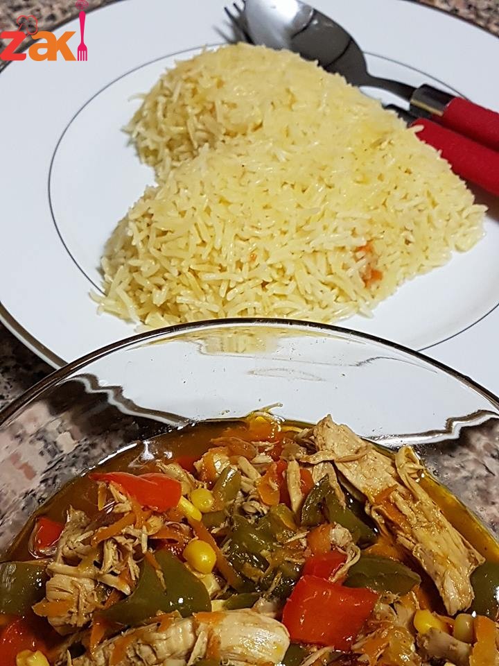 3 كوب أرز أمريكي3 حبات فلفل أخضر رومي3 حبات فلفل أصفر2 حبة فلفل أحمر4 حبات جزر كبيرة4 حبات بصلراس ثومملعقة زنجبيل مطحونقليل من الكاشو (كاجيو)عبلة فطر (مشروم)دجاجة واحدة مسحبة ومقطعة قطع صغيرةصويا صوص