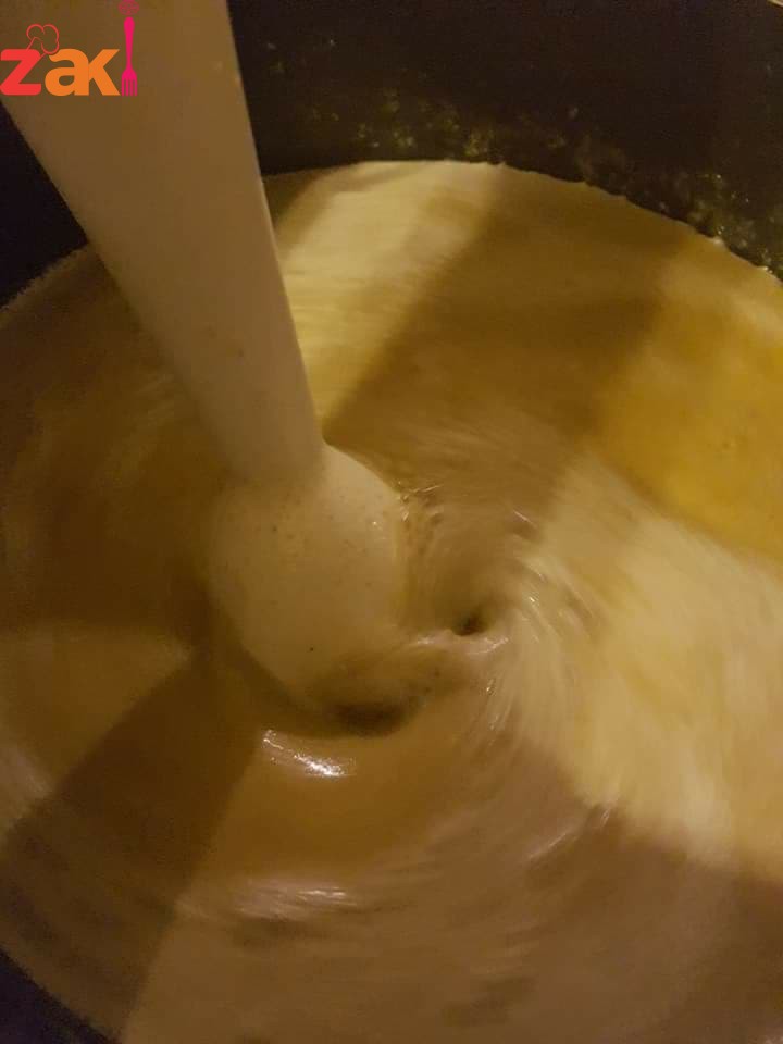 نحمص الطحين مع الزيت ونضيف التوابل مع التقليب ثن نضيف الخليط( مرق الخضار المطحون)