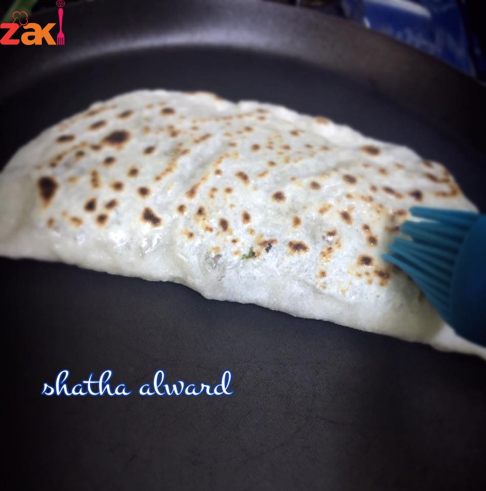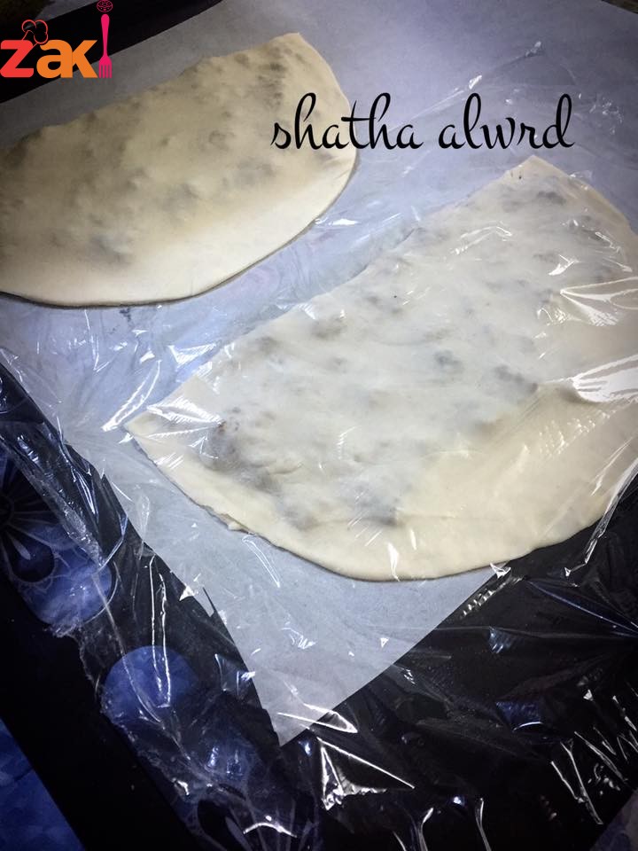 تقطع العجينة تفرد بشكل رقيق جداً توضع الحشوة اما قيمة او جبن مع بقدونس او كرفس