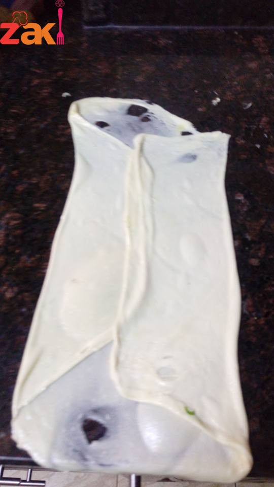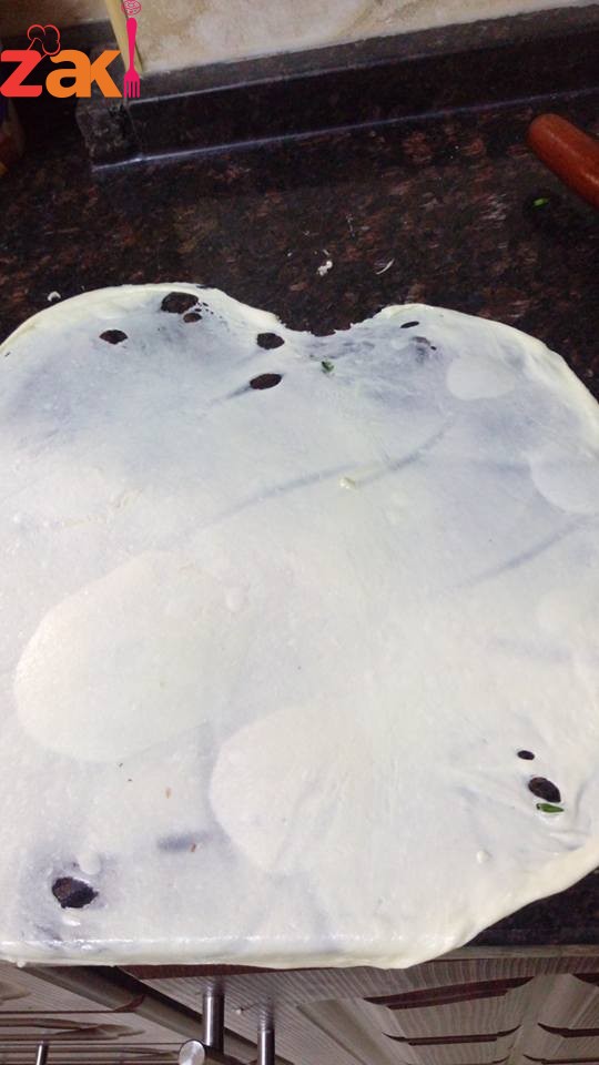 بعدين قطعت العجين كرات متوسطة ورقيتهم بمرقة العجين لحتى صارت العجينة شفافة دهنتها زيت ثنيت طرفين العجينة للوسط كما هو بالصورة حطيت معلقتين من حشوة السبانخ ورديت الاطراف التانية فوق بعض متل المطبق لحتى يصير عنا مربع وبنصفهم في صينية مدهونة بزيت زيتون وخليكي كريمة شوية بالزيت