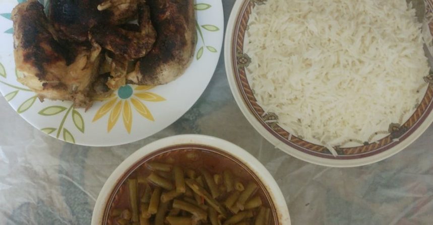 الفاصوليا الخضراء مع الدجاج المحمر والأرز
