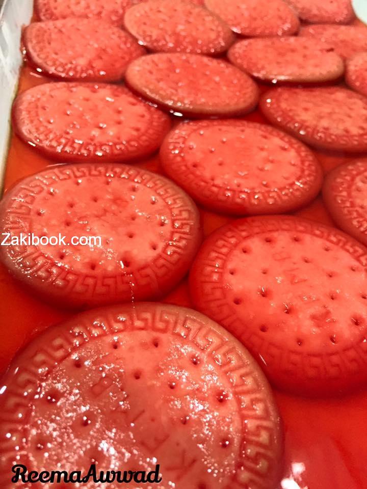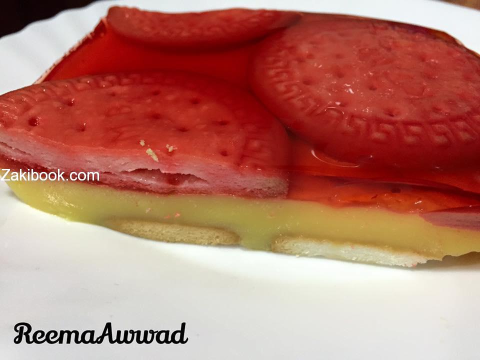 – بعدين بتحضري الجلي حسب التعليمات اللي بتكون مكتوبة على العلبة وبتخليه على جنب، وبتجيبي صحن بتحطي فيه شوية ماء ( وبتضعي كاكاو أو نسكافيه أو حليب حسب النكهة التي تحبونها) وبتغطي البسكوت في الماء وبترتبيه فوق طبقة الكاسترد مباشرة بس لا ترصيهم كتير على بعض عشان لما تضيفي الجيلي رح يشربوا الجلي وينفشوا.