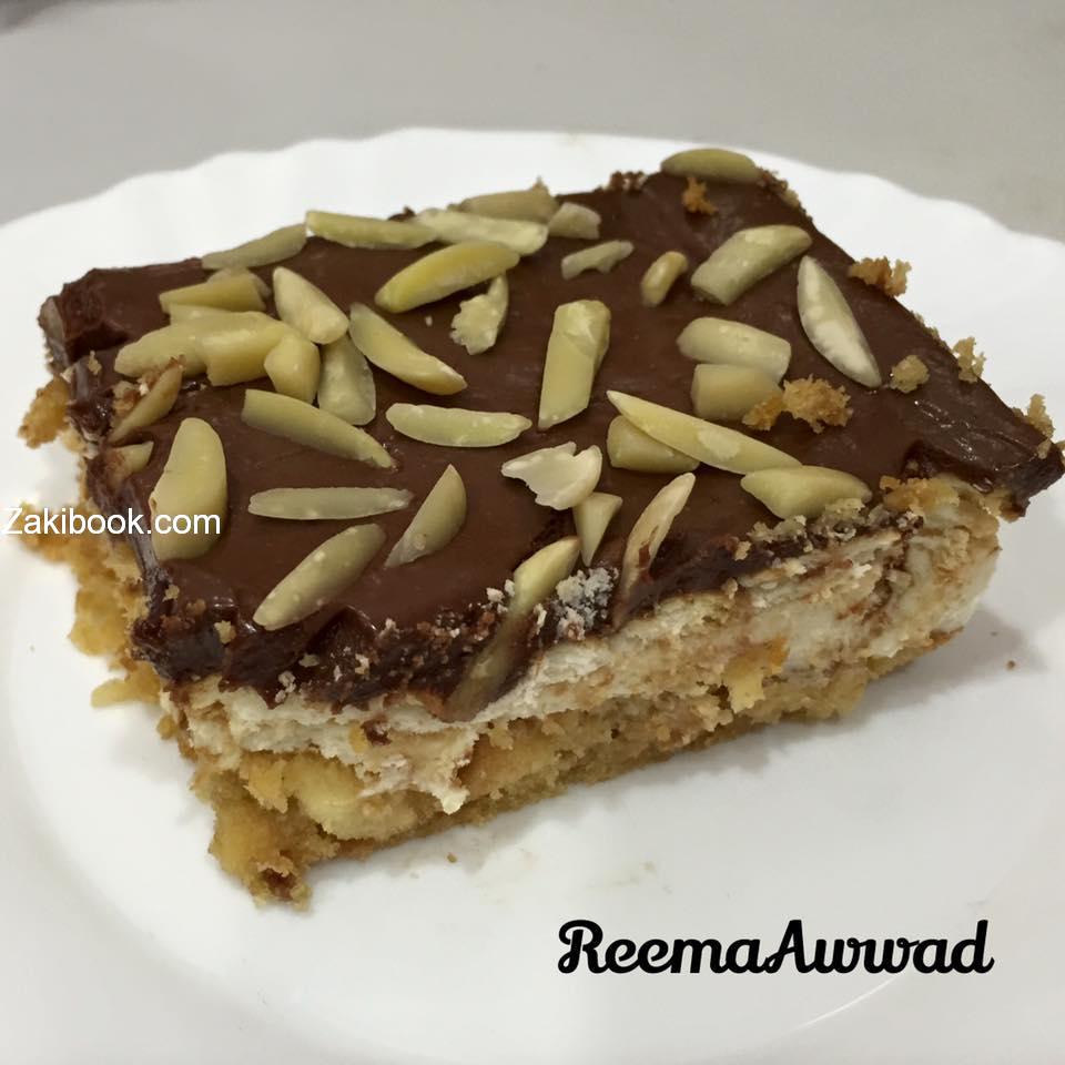 ٢ بيضة، ١/٢ كوب سكر، ١/٢ كوب زيت، ١/٢ كوب ماء، م ص بيكنج باودر، م ص ڤانيلا، ٢ كوب بسكوت ميري مطحون.