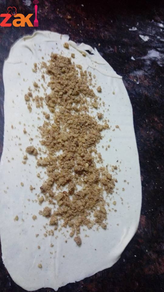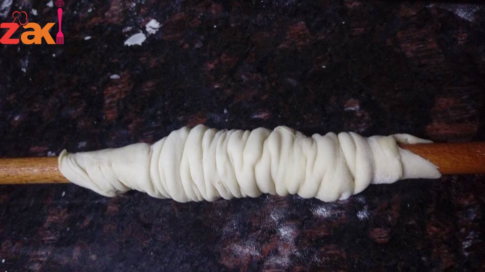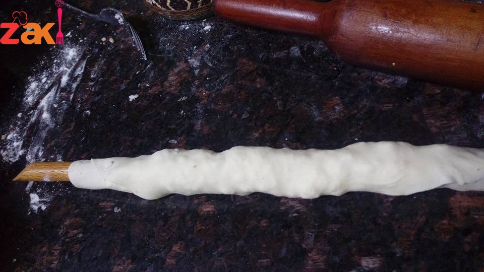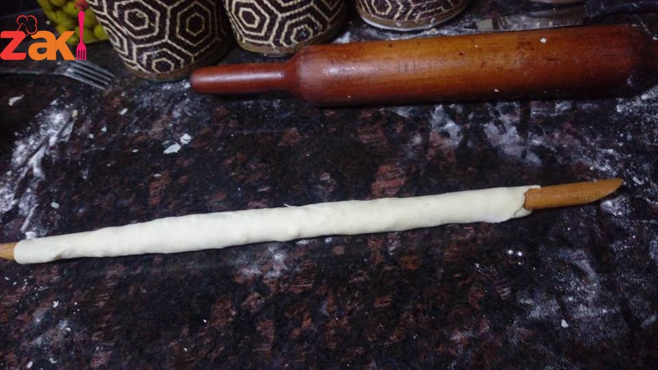 بقطع العجينة لكرات صغيرة وبرق كل كرة على حدا وبعملها بشكل طولي وبفرش الجوز المفروم فوق العجينة وبجيب عصا رفيعة بحطها على طرف العجينة وببرم العصا ع العجينة وبضمهم على بعض حتى يصبح شكل العجينة مجعلك