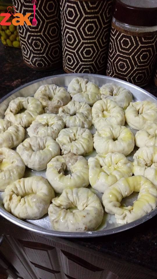 وبسحب العصا وببرم العجينة على شكل كعكة وبصفهم بصينية مدهونة سمنة ..وعملت كم حبة بجبنة بيضة بنفس الطريقة .