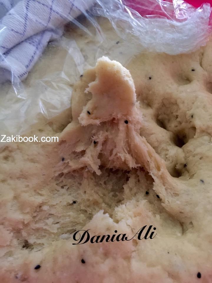 – تترك العجينة بمكان دافيء لترتاح لمدة نصف ساعة.