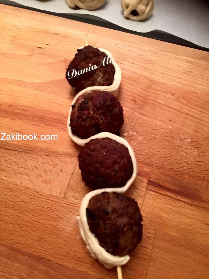 – وقصيت منها شريط واستخدمت سيخ الشوي الخشب دهنتة شوية بالزيت وكنت عاملة كفتة راس العصفور باردة دخلت طرف العجينة بالسيخ وبعدها الكفتة وتبقى الكفتة قريبة من حافة السيخ المدببة واسحب شوي شوي الكفتة والعجينة.