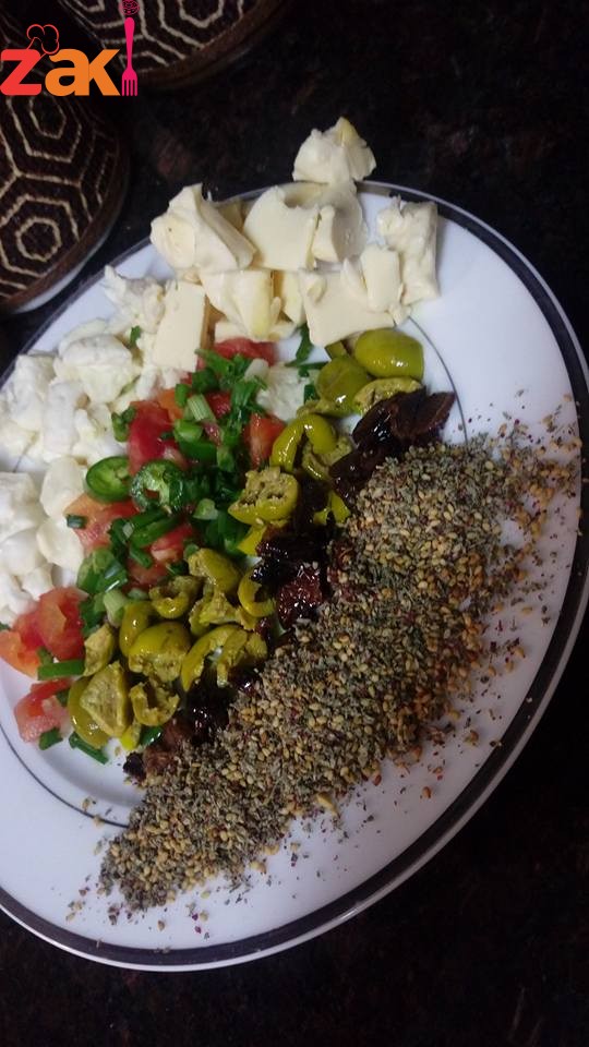 ملاحظة احنا ما اضفنا ملح كمية كافية لانه الجبنة البيضة فيها ملح والزعتر والزيتون فيهم ملح ..