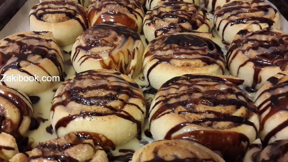 – وبتشتغلي فيها .. بترقي العجينه علی شكل مستطيل كبير وبتفرديها .. بتدهنيها زبده او زيت .. وبترشي عليها ثلاثه فناجين سكر او حسب الرغبه بنرش قرفه وبودرة كاكاو .. وبنلفها علی شكل روول وبنقطعها وبنحطها بصينيه مدهونه زيت او زبده وبنريحها 10 دقايق وبنخبزها .. مابتاخد وقت.