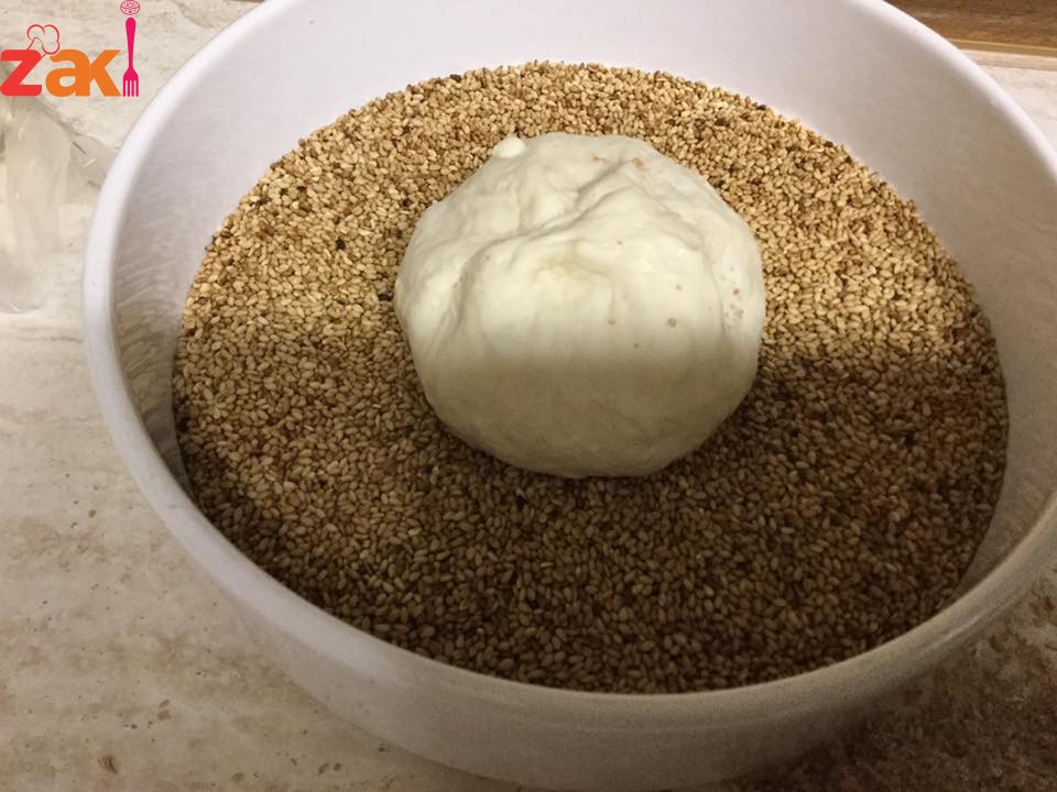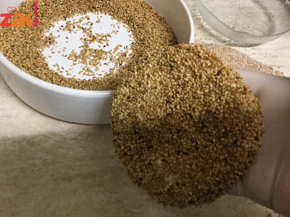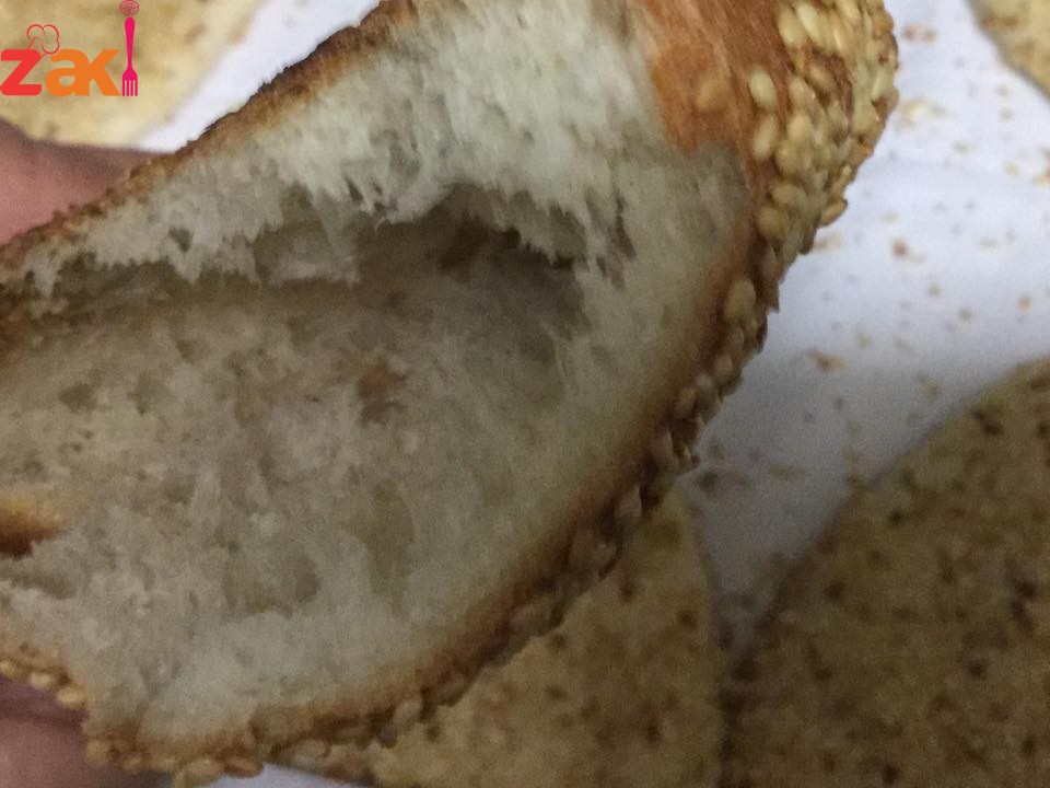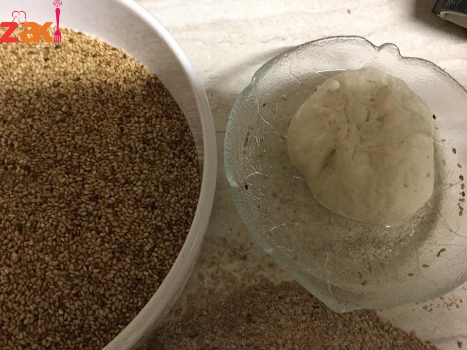 وتقطع حسب الرغبة وكل قطعة تبرم على شكل طابة ونصفهن على نيلون متباعدين عن بعض وناخد بعين الإعتبار انو كل طابة رح تصير ثلاث اضعاف الطابة ونغطيها بلنيلون من جميع الجهاة نحضر صحن عميق ونضع فيه ماء دافئ حتى نغط الطابة بلماء وممكن اضافة ثلاث ملاعق دبس مع الماء حتى تعطي لون احمر ولمعة اختياري ومن ثم بالسمسم المحمص وبكف اليد نضغط على الرغيف حتى ياخد السمسم ومن ثم نمسح الوجه الثاني بكف اليد بلماء الدافئ ونضع الرغيف على قشور القمح ( ردة ) والطحين المخلوطين مع بعض ونرق بكف اليد حتى تصبح لدينا رغيف بسماكة اقل من نصف سم