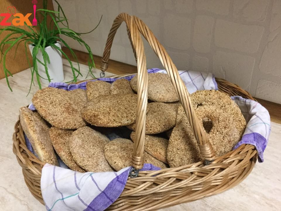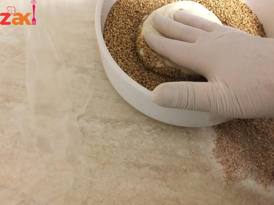 وقليل من الماء الدافئ للتغطية بلسمسم والقشور القمح حتى لا يهرهر من عن الأرغفة