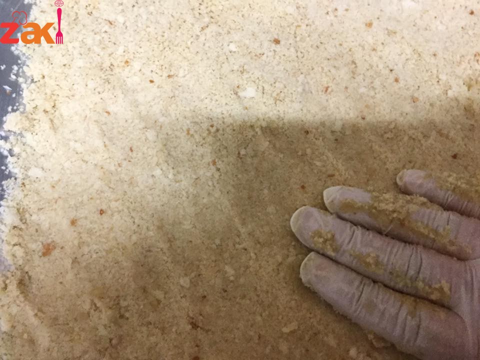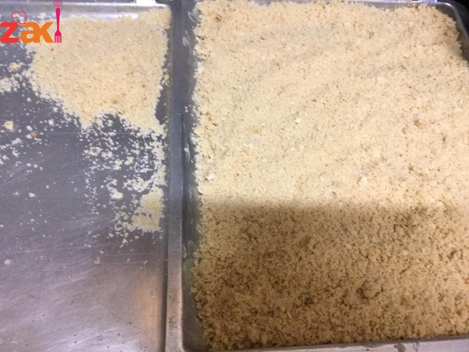اولاً اطحني التوست مع الخليط السمن والزبدة المذوبة والقطر حتى يعطي لون جميل بلخبز والماء الزهر وماء الورد والمحلب كلهن مع بعض حتى يصبح الخليط مثل البقسماط الناعم