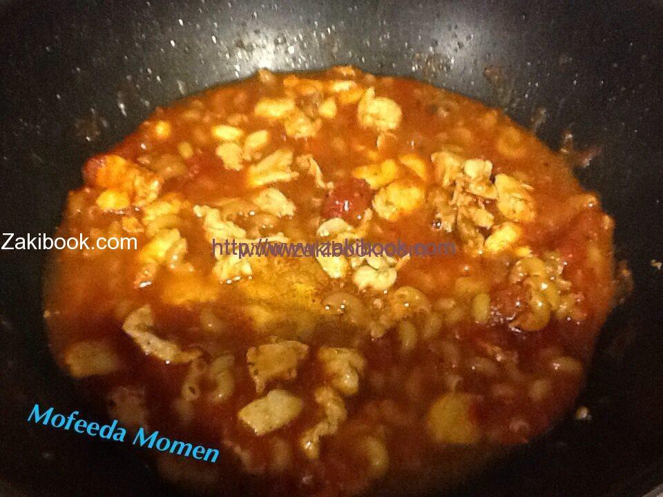 – وبعدين نضيف كوب عصير طماطم و١/٢ كوب ماء وملح وفلفل ومكعب مرق (ماجي) بس تغلي نضيف المكرونة ونغطيها ونسيبها تستوي وإذا احتاجت ميه بمضيف شوية شوية وبعد ما تستوي بنغرفها ونرش عليها جبنه مبشورة وبالهنا
