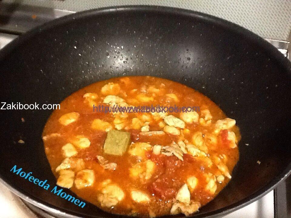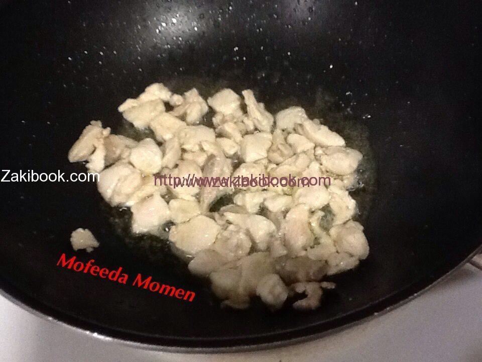 – نقطع ٢ صدور دجاج مكعبات وقلبهم في ملعقة زيت وبعد ما يتغير لونهم بن ضيف ٢ فص ثوم مفروم ونقلب بسرعة.