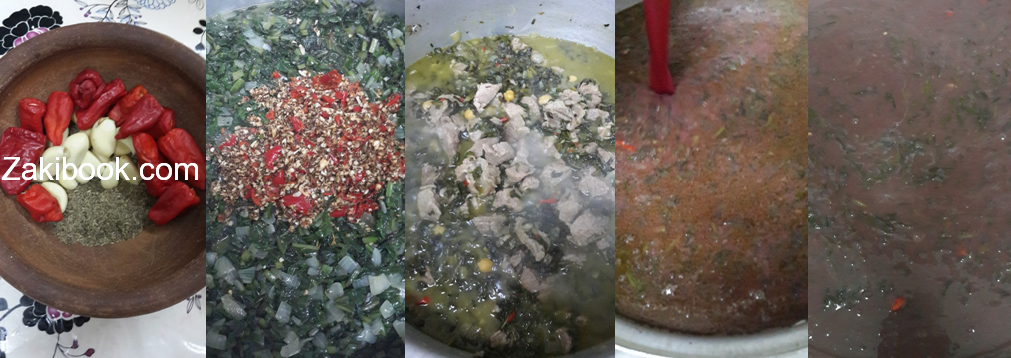 – وبنعمل الدقة من عين جراده ناشفه وفلفل احمر حراق وثوم وبنحطهم على السلق وبنحط الحمص واللحمه وشوربه اللحمه وملعقه كمون وكاسه زيت زيتون وبنخليها على النار حتي يستوي السلق.