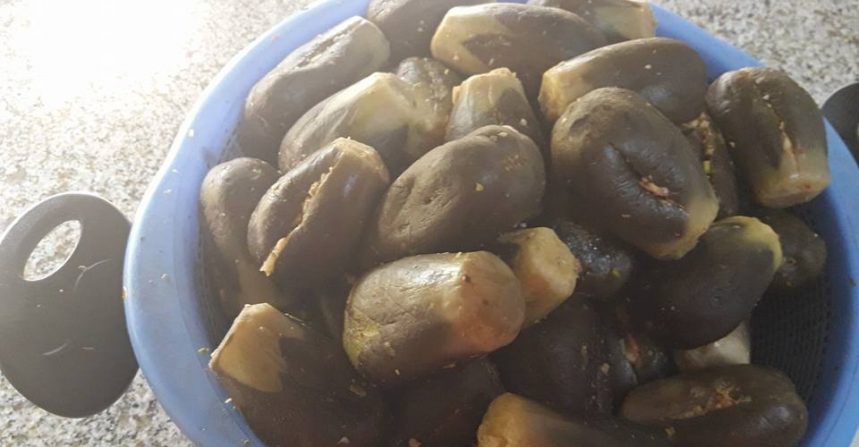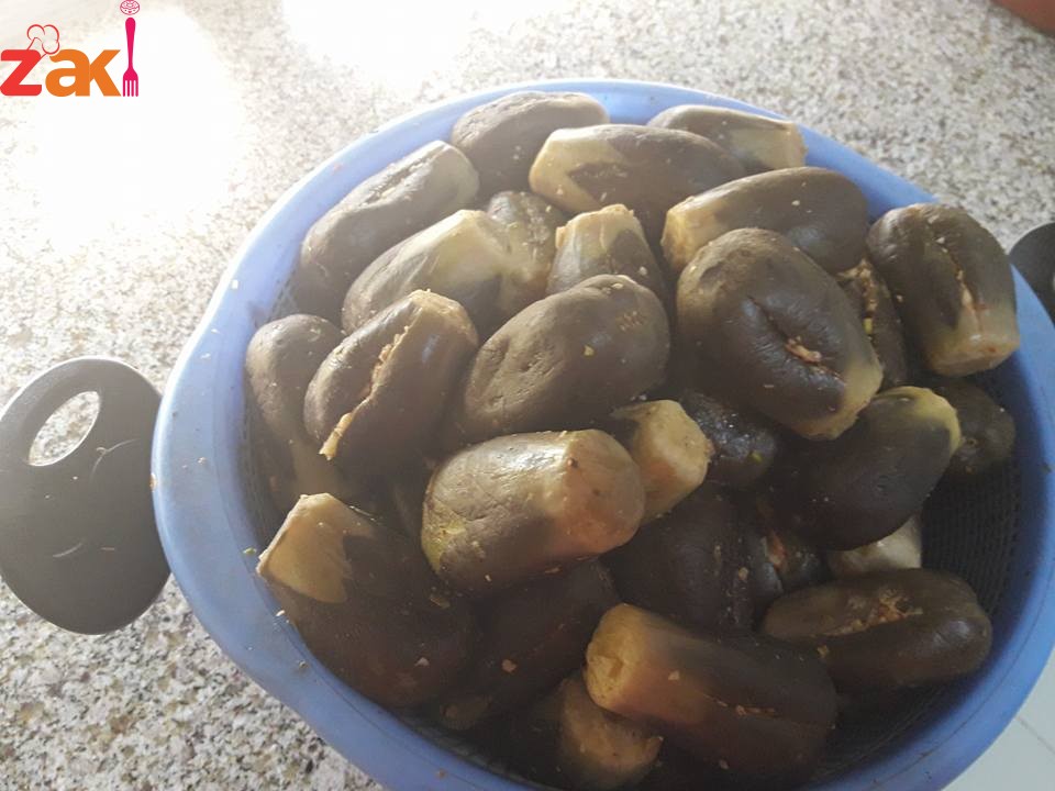 نختار باذنجان خاص للمكدوس ويشترط ان يكون حلوا وبعد غسله وتنظيفه نقوم بسلقه نصف سلقه اي دون النضج