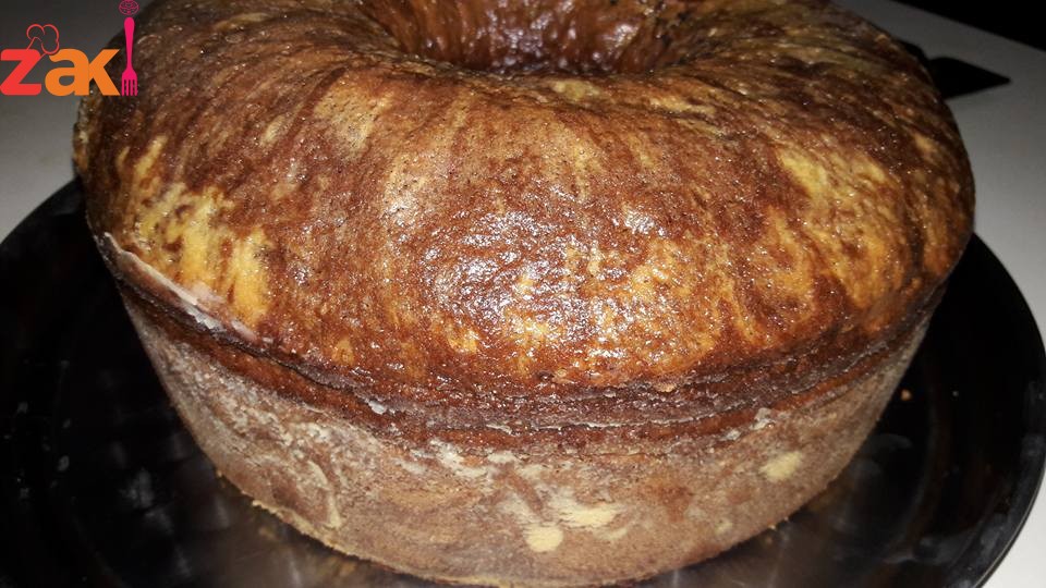 ثم نقسم الخليط لقسمين القسم التاني بنضيفله ملعقتين كاكاو خام منخول وبندهن القالب بالزيت وبنبطنه بالدقيق وبضيفي مره من الابيض ومره من البني فوق بعضه وبنخبزه على نار هاديه جدا وبياخد وقت 50 دقيقه …
