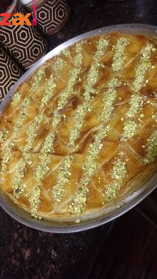 جبت صينية ودهنتها زبدة نباتية وحطيت راقتين كلاج ودهنتهم زبدة وحطيت كمان 3 راقات كلاج وبعدين فردت الجبنة على قد الصينية وبعدين حطيت كمان 5 راقات ودهنت وجههم زبدة نباتية وقطعتهم قبل ما اشويهم ..وخبزتهم بالفرن وحمرتهم وشربتهم بالقطر