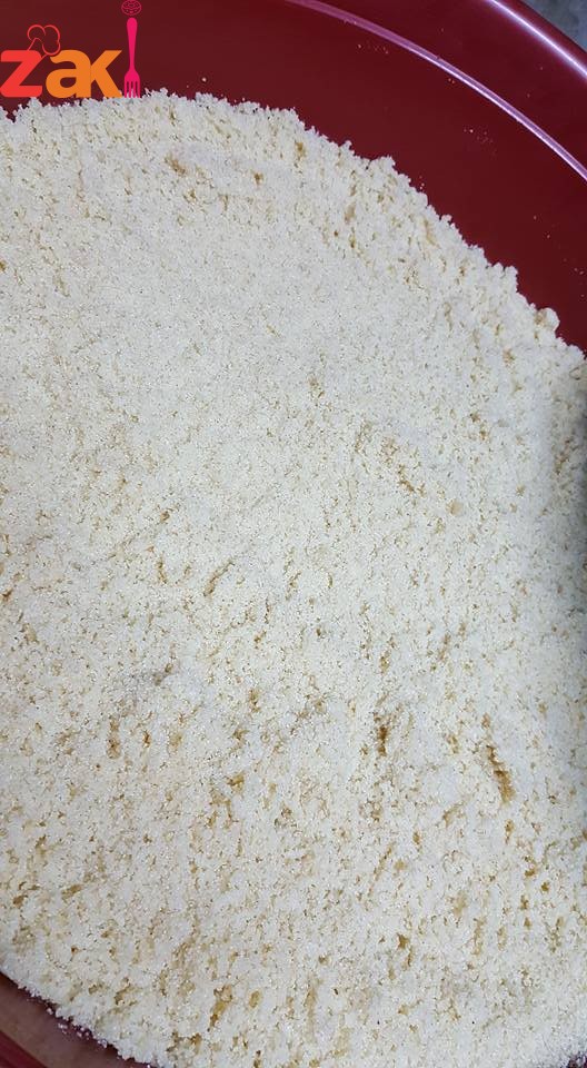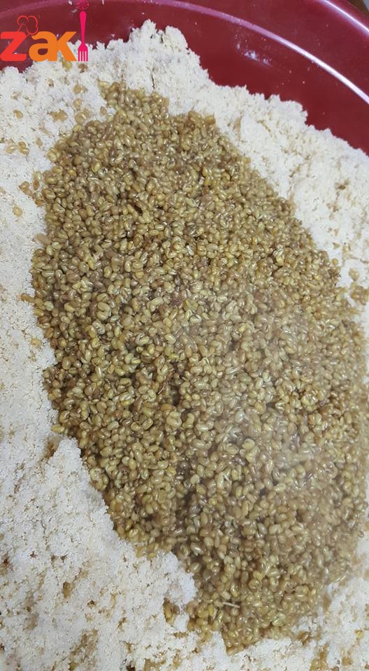 بنبس السميد بالسمنة والزيت وبنضيف عليهم الخميرة وبنضيف الحلبة وينعجنهم بمية الخلبة او بمي فاترة تقريبا بدنا كاسة لكاسة ونص مي