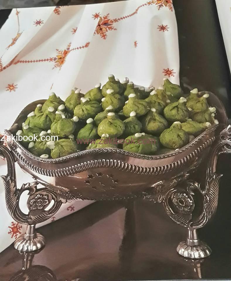 – في وعاء تخدم (تخلط) الزبدة والسكر يضاف إليهما ماء الزهر والملكة الأخضر ونضيف الطحين شيئا فشيئا حتى تصير العجينة متماسكة تعمل منها كويرات على شكل كويرات متوسطة الحجم.
