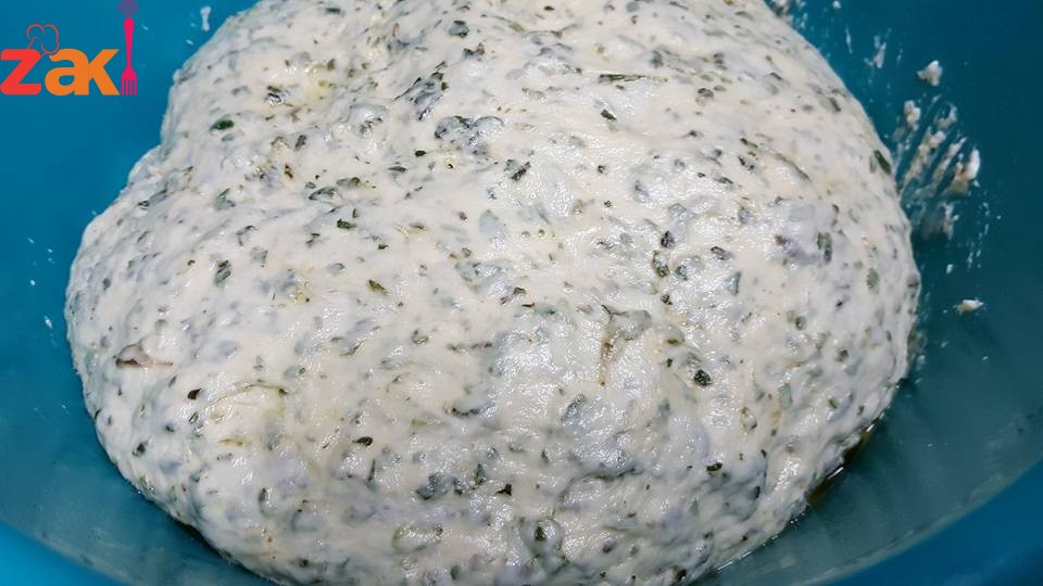 بنخلط المواد الجافة كلها سوى وبنضيف ورق الزعتر وبنخلط السوائل كلهم سوى وبنضيفهم بالتدريج للطحين لنحصل على عجينة لو كانت بتلزق عادي لان في ورق الزعتر