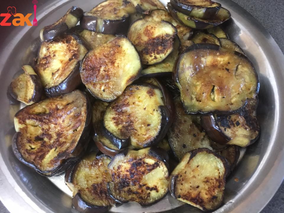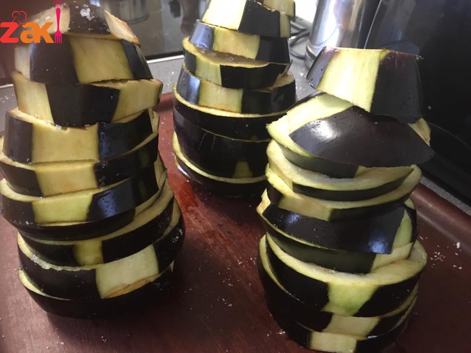 يقطع البيتنجان دوائر ويرش بالملح وتوضع الشرحات فوق بعض كما في الصورة وبعد ربع ساعة يعصر منهم الماء ويصفوا على صنية مدهونة زيت زيتون وندهن وجههم زيت زيتون وندخلهم الفرن او تحت الشواية حتى يأخذوا لون.