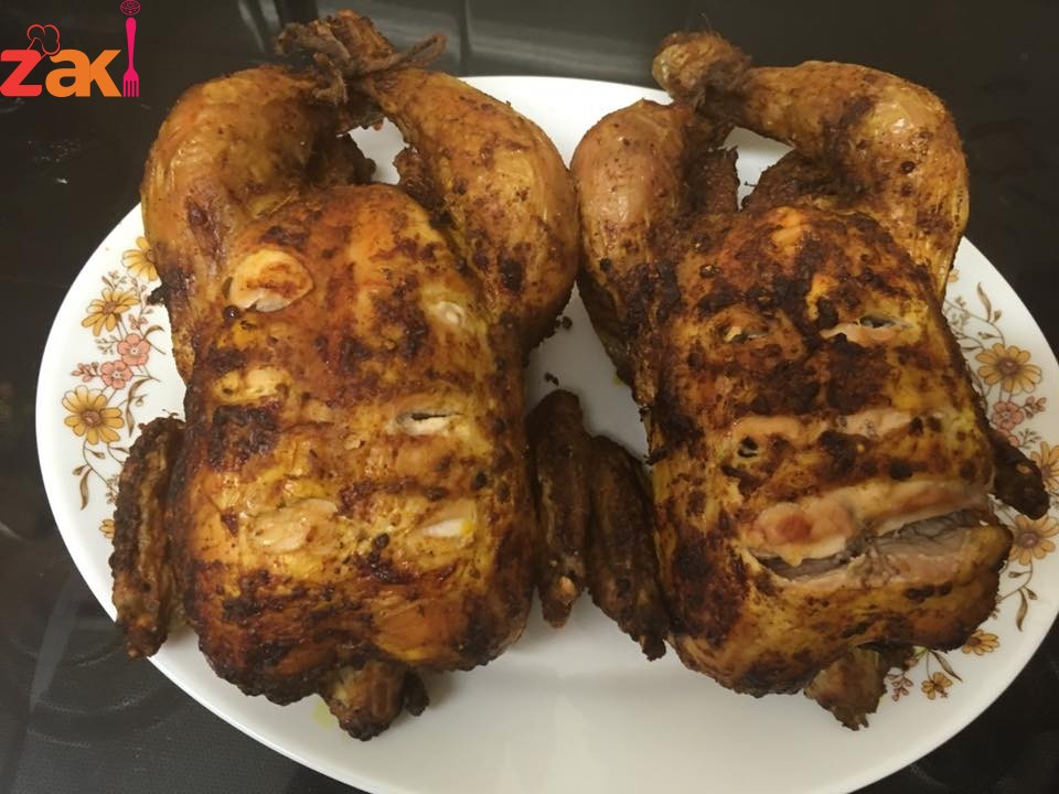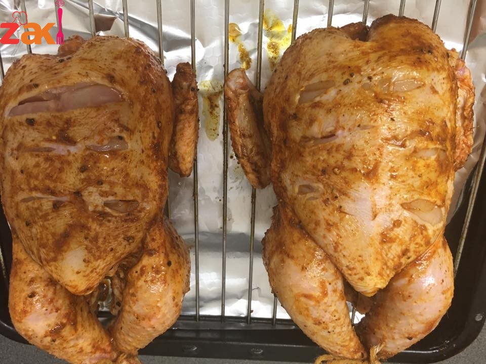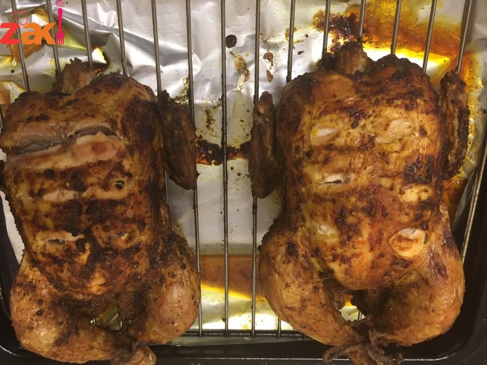 وخلطتن مع معلقتين كبار زيت زيتون وعملت شقوق بالفراريج ودهنتن بالتتبيلة. وبين الشقوق. وحطيت بتجويف كل فروج ورقة غار وقطعة بصل وربطتن بخيط قطن وحطيتن على صنية عليها شبك ودخلتن فرن وسط حوالي ساعة حتى نضجوا وتحمروا.