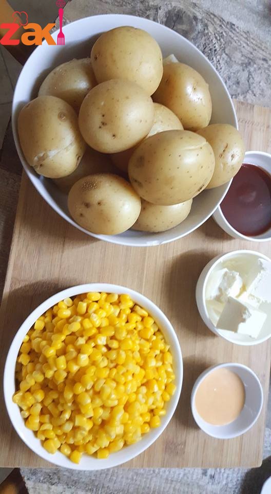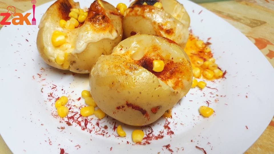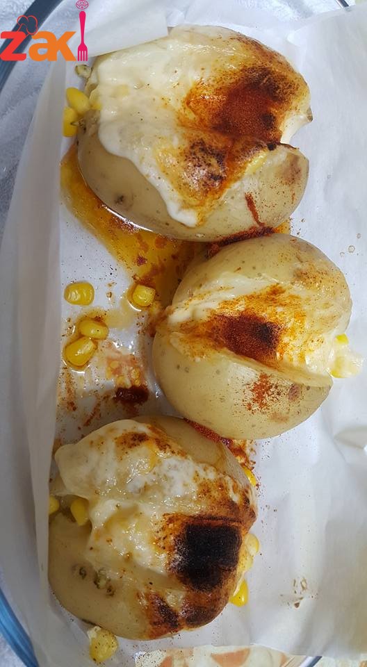 وبعدها حطيتها على ورق زبدة وفتحت الحبات وحطيت مكعب زبدة وبرش جبنة ورشيت عليهم بهار البطاطا هو عبارة عن ثوم بودرة وببريكا وحطيتهم بلفرن يتحمرو وطبعا ضفنا ذرة للتزيين