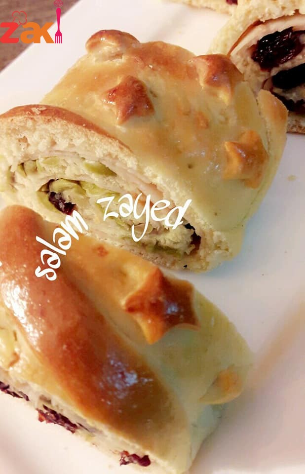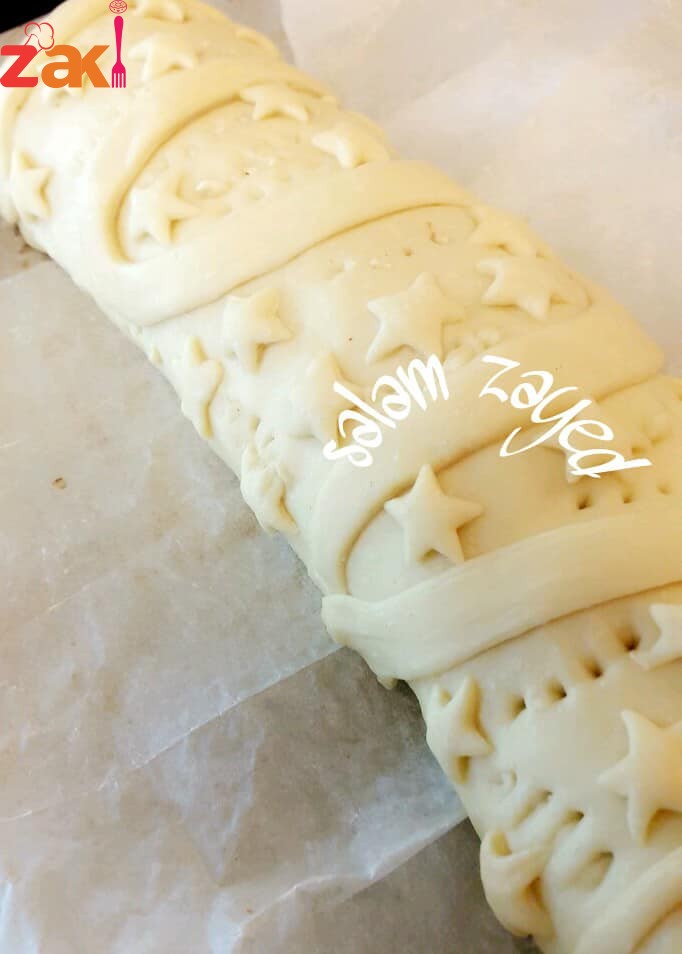 وبلفها رول مع كبس الاطراف ممكن تخلوها سادة ما عليها شي او بالعجين الزائد تعملوا اشكال وتثبتوهم عالخبزة بعمل فتحات بالشوكة