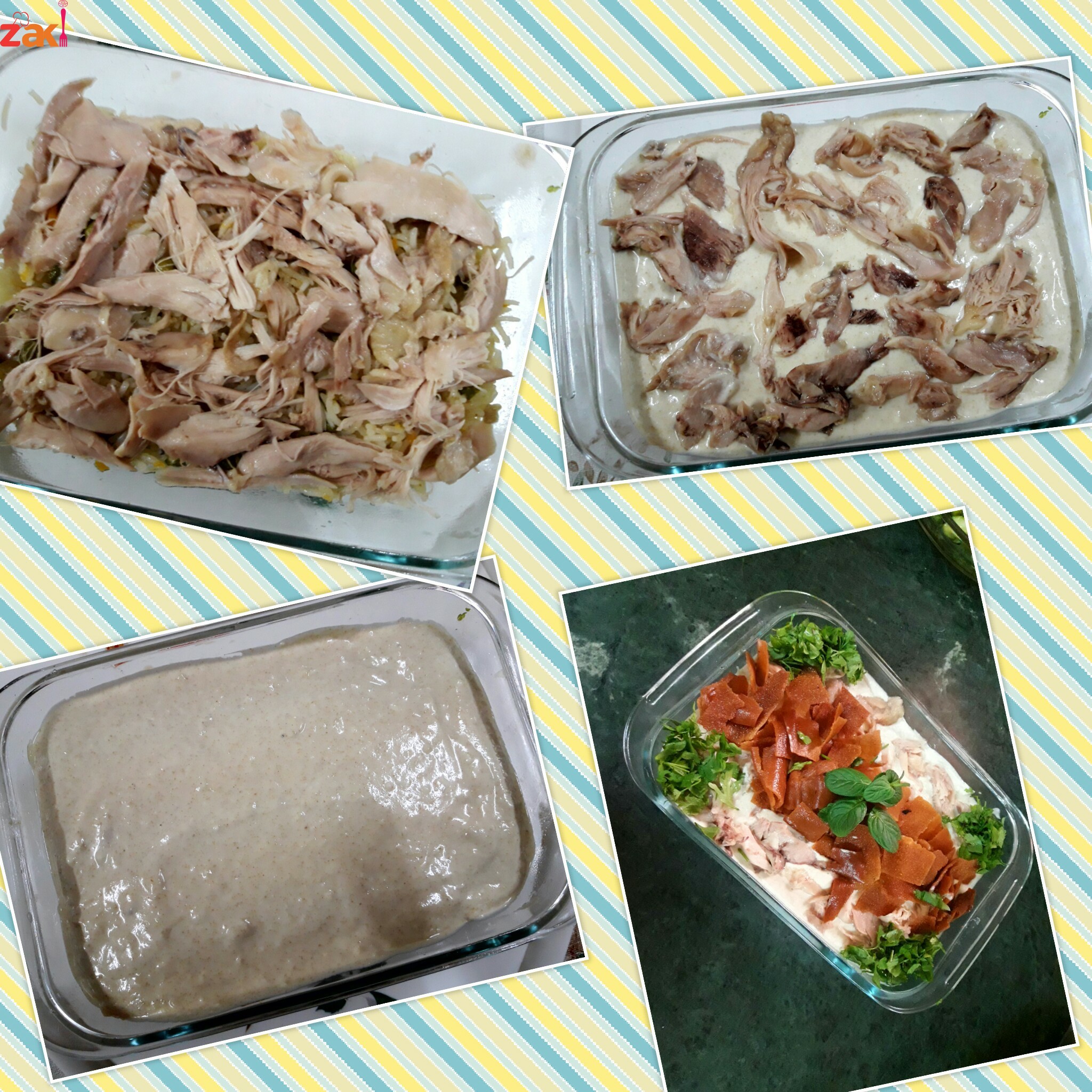 4) نضع بجاط التقديم الخبز المقلي بالقاع ونضيف عليه شوي من مرقة الدجاج الساخنة ونقلهم بسرعة ونفردهم ثم نضع طبقة بسيطة من الرز ثم نضع الدجاج عليهم بحيث نغطي الرز ونضيف عليهم صوص الطحينة وهو عبارة عن ( لبن وطحينة سائلة وملح وعصير ليمون زثوم مهروس نخفقهم جيدا حيث يكون لا سميك جامد ولاسائل ونغطي طبقة الدجاج بالطحينة ثم نضع الدجاج المفتت ونزينهم بالخبز المقلي والبقدونس و ممكن وضع اللوز او الصنوبر ع الوجه حسب الرغبة والف صحة وهنا