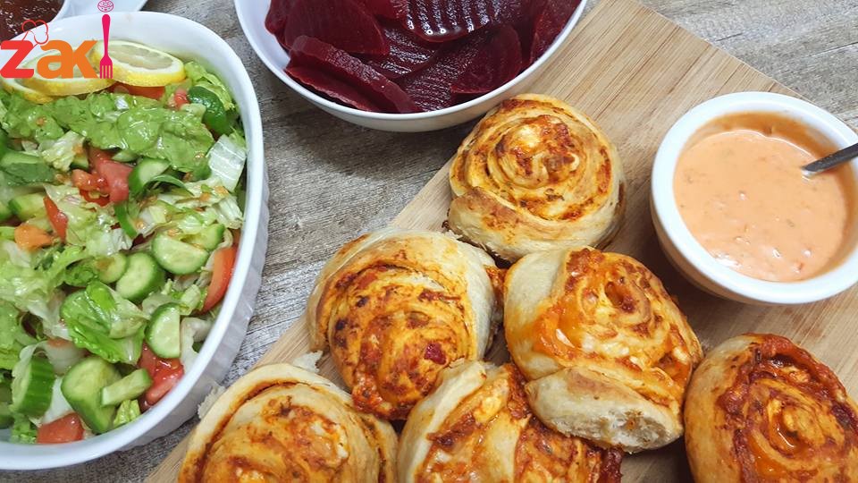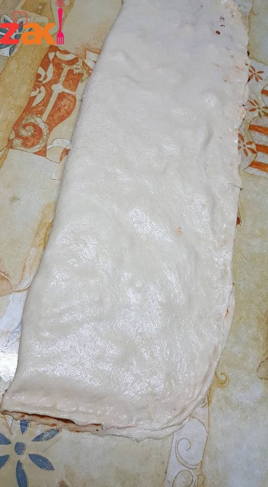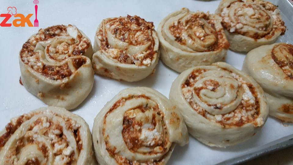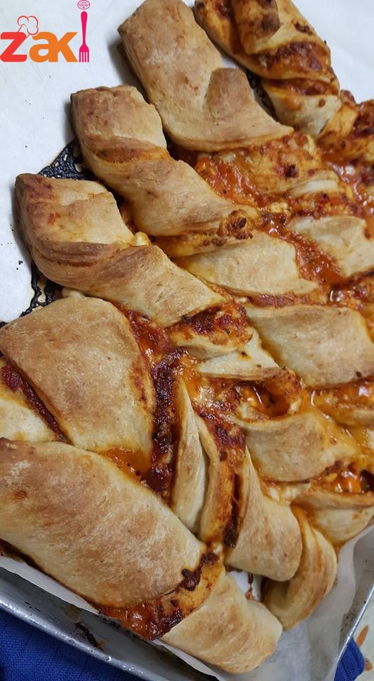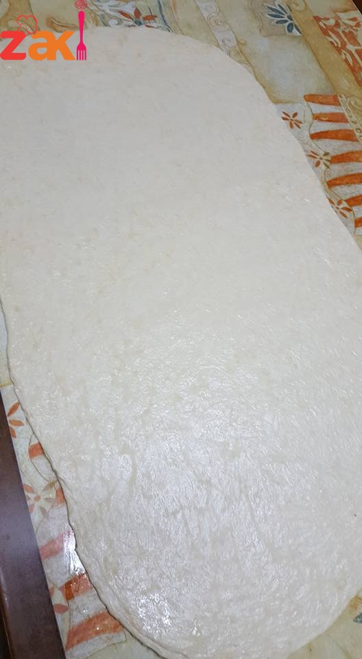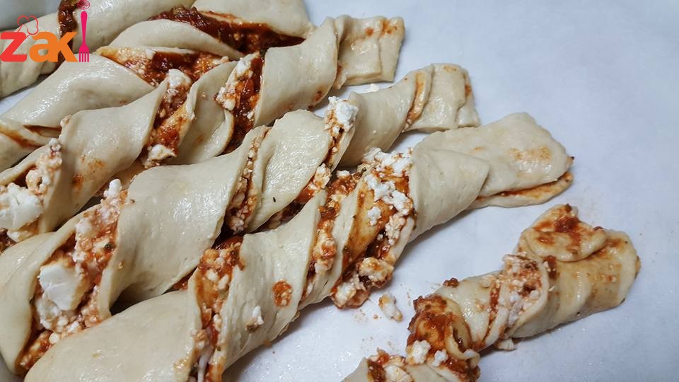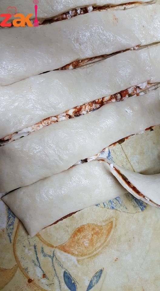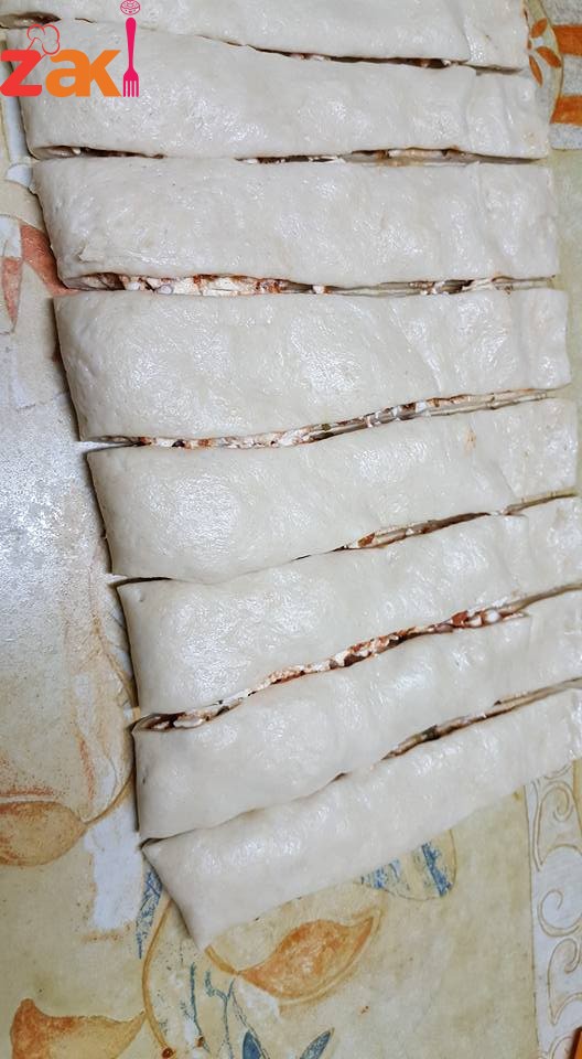 او بنعمل العجينة مستطيل وينحط الصلصة والجبنة وبنثني العجينة من النص وبنقطعها مستطيلات وبنلفهم بالطول