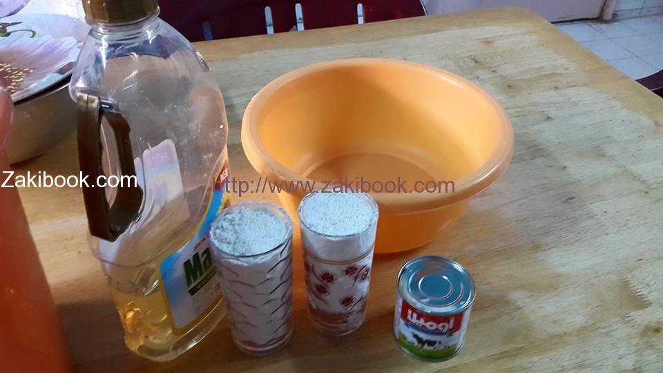 – في وعاء نضع 2 كأس دقيق منخل ونضيف عليه ربع كأس حليب مبخر و نصيف عليهم ربع كاس زيت ونص كأس دافئ تعجن وترتاح ساعه.
