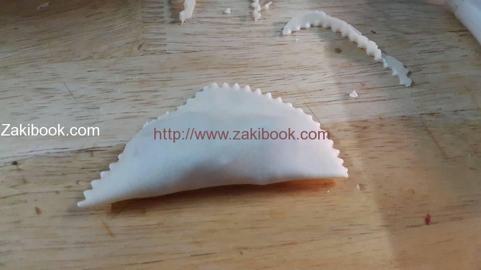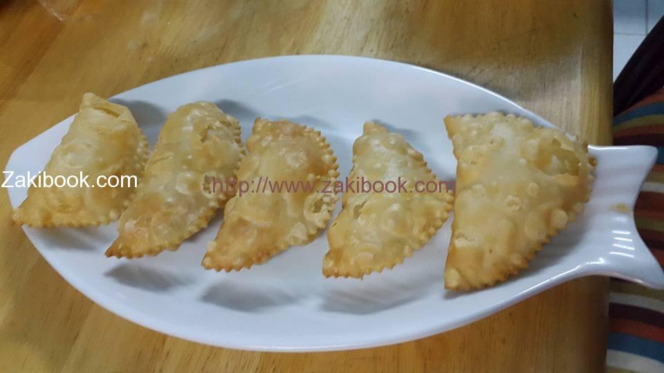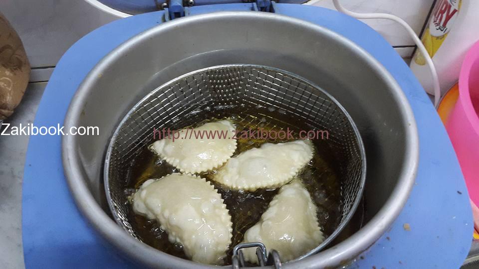 – نقوم بتقطيع العجينة إلى قطع دائرية صغيرة بواسطة طرف فنجان أو كوب , ونضع القليل من الحشوة ونطبق الطرفين معاً, ويمكن استخدام الة ضغط السمبوسك.