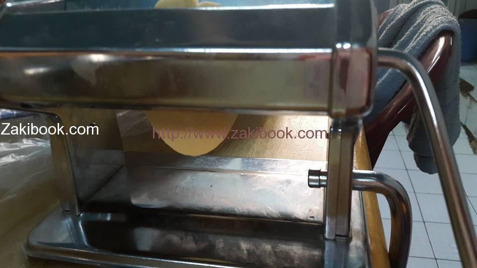 – نفرد عجينة السمبوسة بواسطة الشوباك ( أداة لفرد العجين) أو بواسطة الماكينة الخاصة بالفرد كما في الصورة.