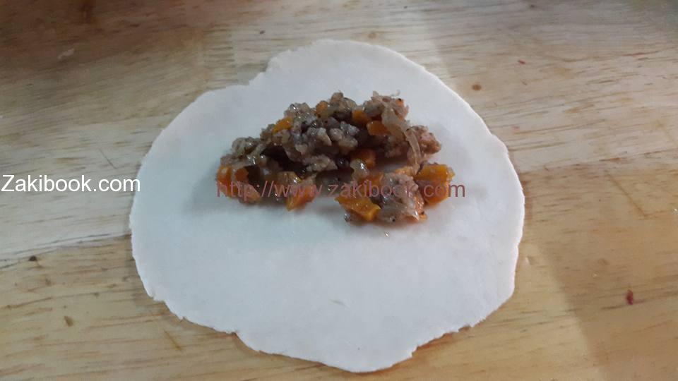 – نحضر الحشوة وهي لحمة مفرومة أو جبنة, وطريقة إعداد اللحم المفروم كتالي, في مقلاية نضع القليل من الزيت, ونضع عليه البصل المقطع حتى تذبل, ثم نضيف اللحم المفروم, والملح والفلفل الاسود والبهارات, وممكن إضافة جزر مسلوق مقطع إلى قطع صغيرة, ونتركها حتى يتغير لون اللحمة وتنشف الماء الذي يخرج منها كدليل على نضوجها.