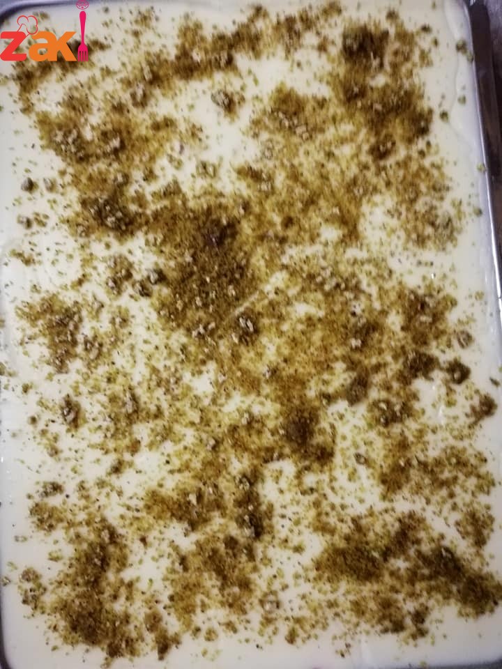3تجهز المهبلية ( عبارة عن حليب وماء ونشا) وتصب فوق الجلي بالتساوي وبحذر ويرش عليه الفستق الحلبي المطحون ويترك حتى يبرد ثم يضع بالثلاجة حتى يتماسك