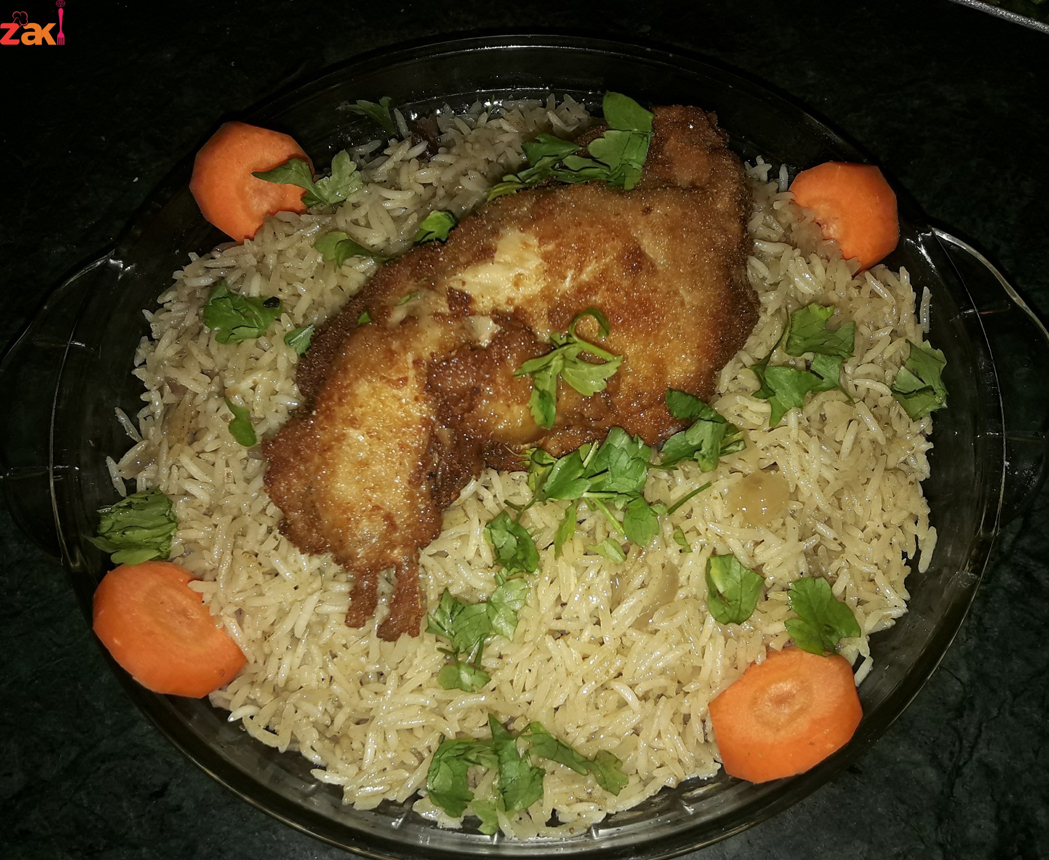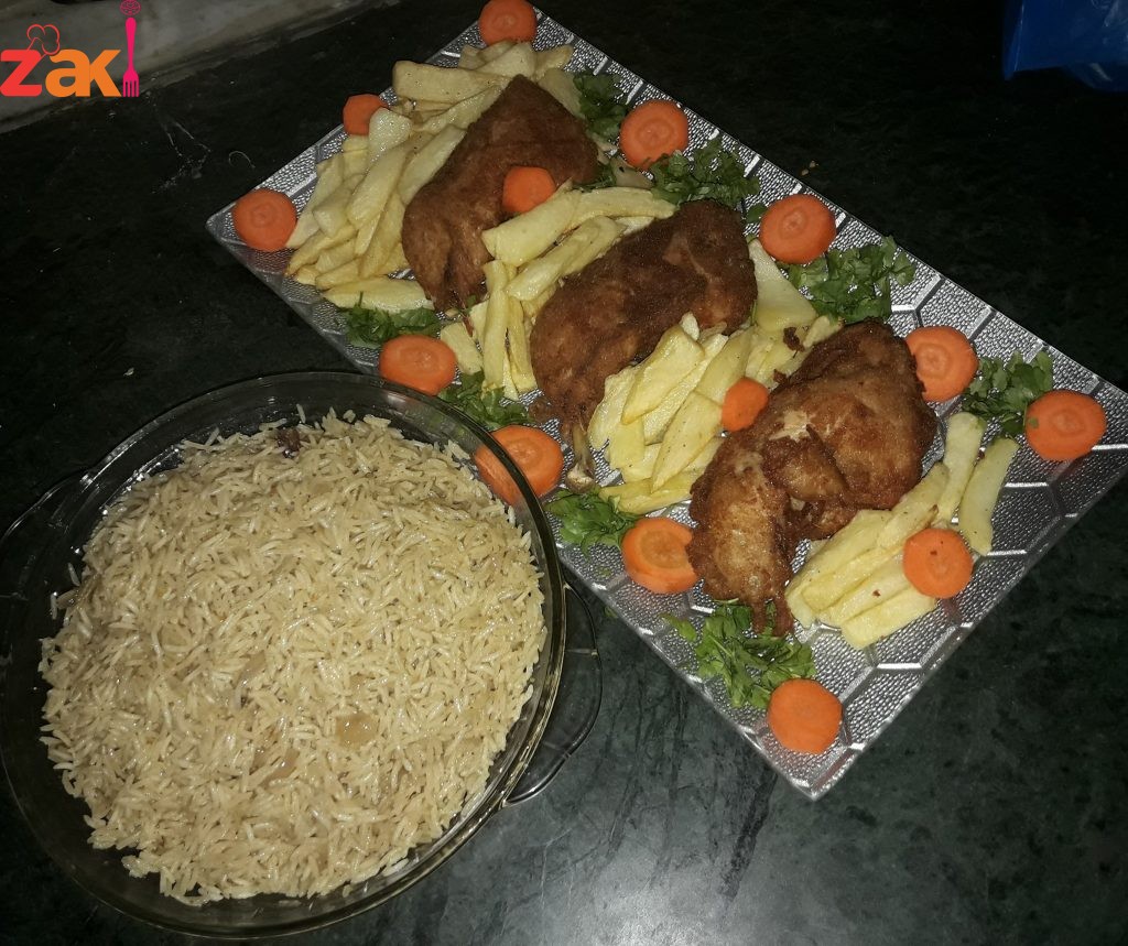 نجهز الرز نضع ٤ ملاعق زيت ونقلي بصلتين مفرومين ناعم ليدبلو ويتغير لونهم نضيف عليهم ٣ فصوص ثوم مهروس وملعقة صغيرة زنجبيل بودرة وملعقة كبيرة ونصف كمون بودرة وملعقة كبيرة بزر كزبرة بودرة وفلفل اسود نصف ملعقة صغيرة بهارات دجاج نحركهم دقيقتين ثم نضيف كاستين رز حبة طويلة المغسول والمصفى ونقلبهم مدة ٣ دقائق ثم نضيف عليهم ٤ كاسات مرقة الدجاج الساخنة والملح ونحركهم ونغطيهم ونتركهم ع نار متوسطة لينشف ماؤهم ثم نضعهم ع نار هادئة جدا ليستو ونسكبهم بطبق التقديم والى جانبهم الدجاج المقلي او السمك والف صحة وهنا