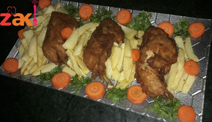 ثم نضع الدجاج بالدقيق ونغمسه من الجهتين ثم ندهنه بالبيض من الجهتين ثم بالبقسماط من الجهتين ونتركه١٠ دقائق ثم نقليه بزيت ساخن جدا ع نار هادئة ليحمر من تحت ثم نقلبه ع الجهة الثانيةونضعه بطبق التقديم مع البطاطس المقلية والبقدونس وتقدم جانب الرز