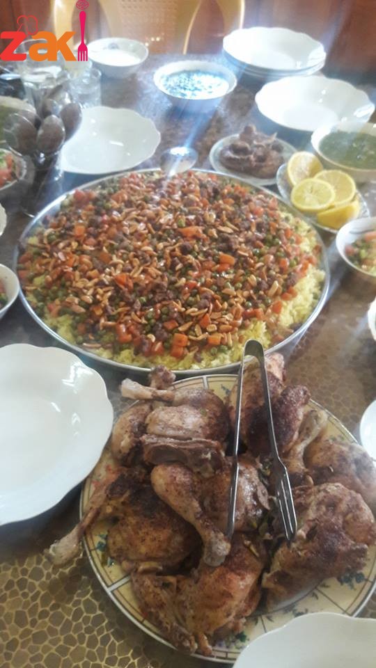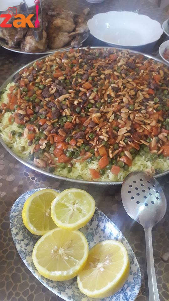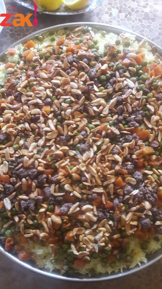 وبنقلي الوز وبعد مايستوي الرز بنسكبو بوعاء التقديم وبنجيب البازيلا والجزر وبنوزعهم على الرز وبنجيب الحمه المفرومه وبنوزعها عليهم واخر اشي بنجيب الوز وبنوزعو عليهم وصحتين وهنا