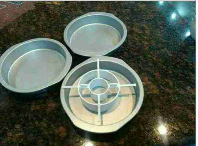 الان نوزع الخليط ف القوالب الثلاث كما موضح في الشكل ثم نضع القوالب في الفرن ع حرارة 180° لمدة 20 دقيقة وعندما تس