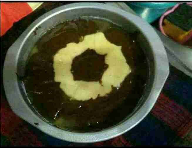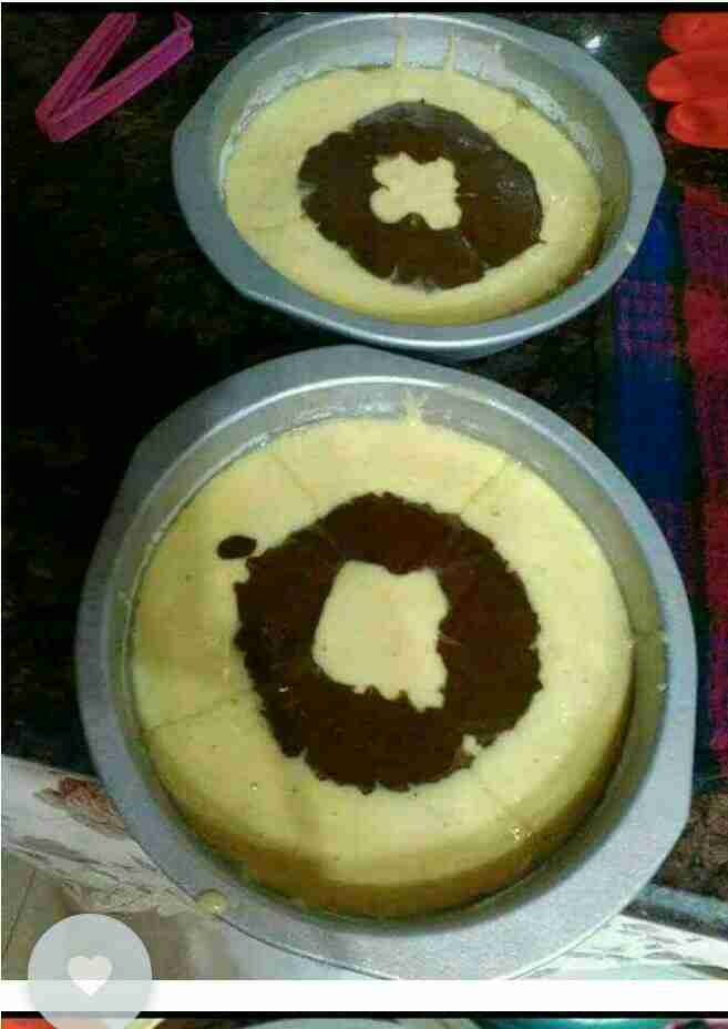 نضع للقسم الاول ثلاث معالق كاكاو ونضع للقسم الثاني ثلاث معالق من الحبيبات الملونة ثم نضع كل خليط في كيس حلواني ( لتسهيل عملية توزيع الخليط،في القالب ممكن نوزعه بالملعقة)