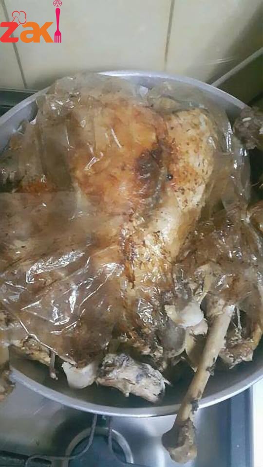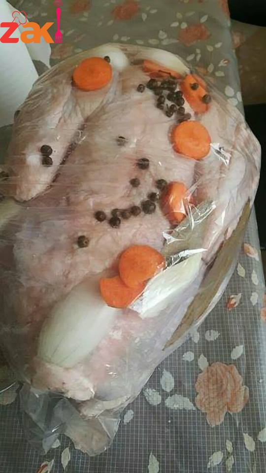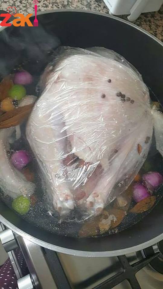 نغسل الديك ونضع على أطرافه االتوابل الخشنه والجزر المقطع لسحب الزفره والبصل المقطع ويوضع بكيس الطبخ