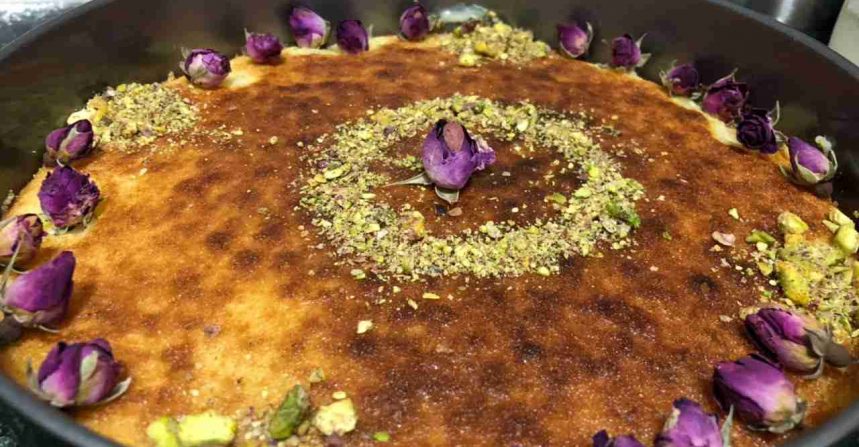نضع في الصينية نصف مقدار عجينة البسبوسة ونضعهم في الفرن وبعد الاستواء نضع فوقها القشطة والنصف الثاني من العجينة ونضعها في الفرن
