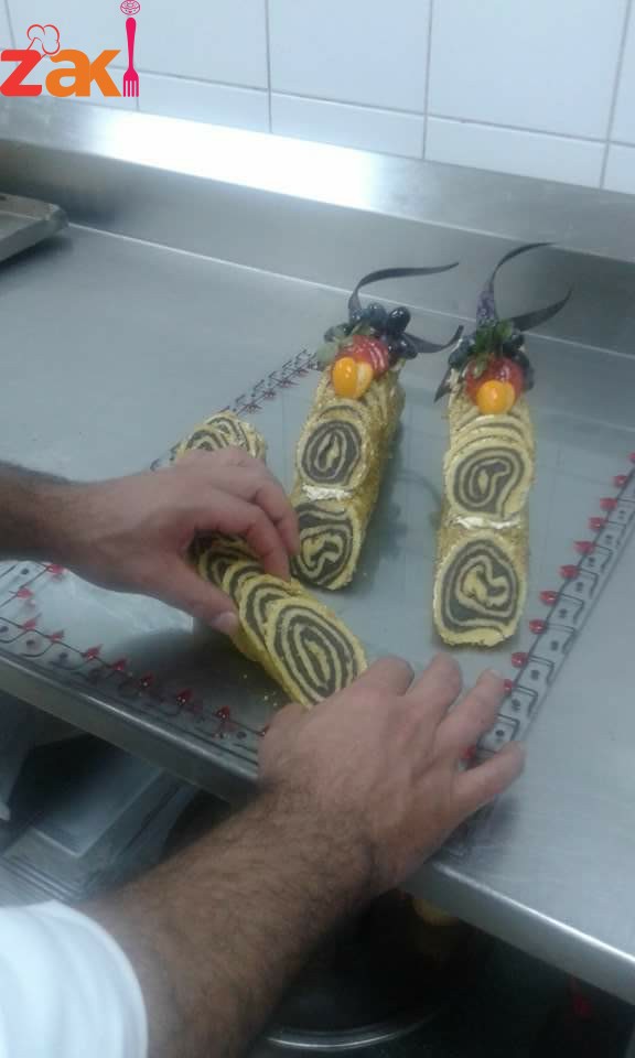حتي ياخذ اللون الذهبي يخرج ويبرد ويوضع في الثلاجه لحين لفه وحشوه وتفنيشه